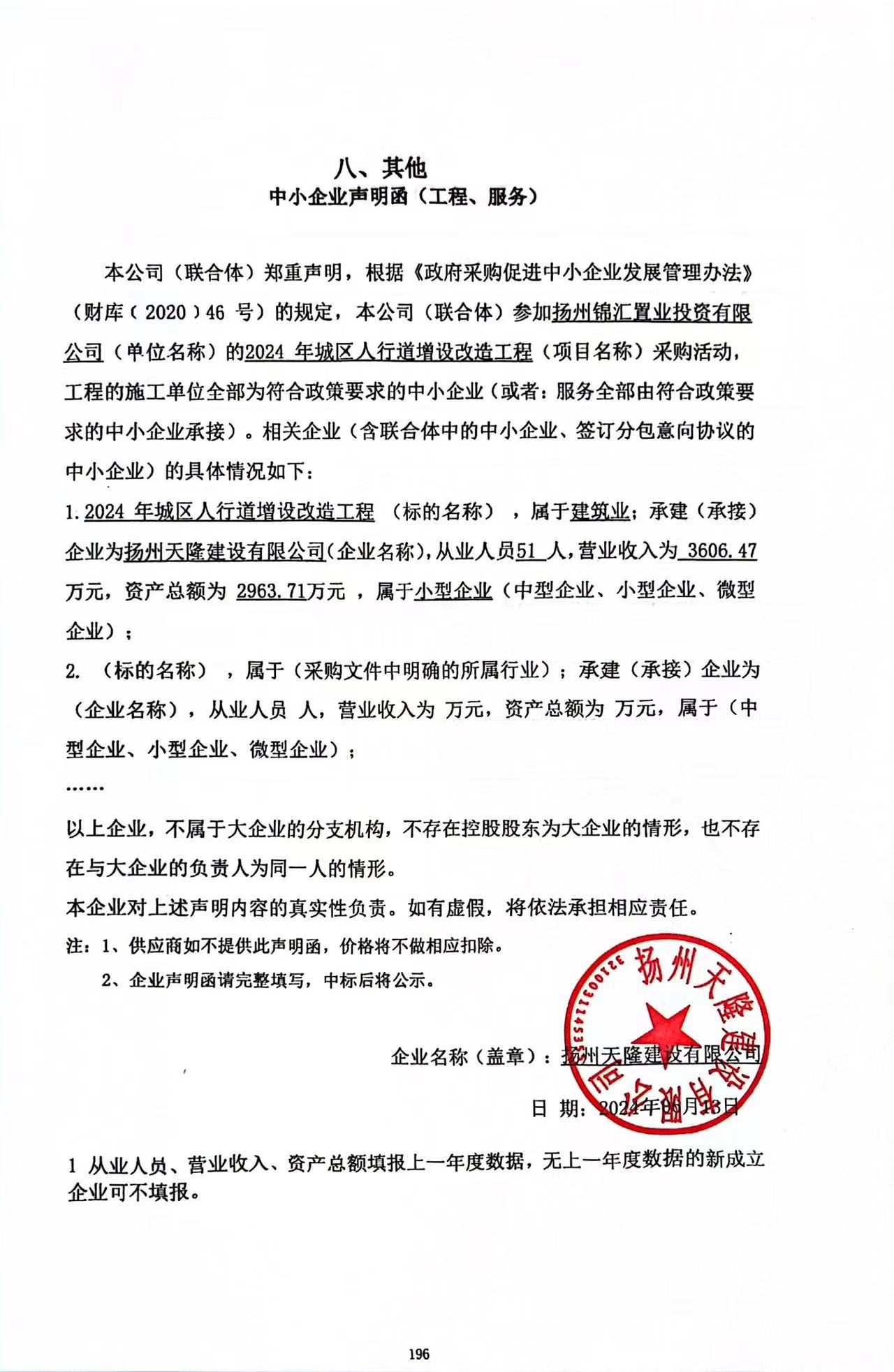 五、評審專家名單:楊坤、沈樹超、徐敬雯 六、公告期限 自本公告發(fā)布之日起1個工作日。 七、其他補充事宜 無 八、凡對本次公告內容提出詢問,請按以下方式聯系。 1.采購人信息 名 稱:揚州錦匯置業(yè)投資有限公司 2.采購代理機構信息 名 稱:揚州筑苑工程招標咨詢有限公司 地 址:揚州潤揚北路19號 聯 系 人:李斌 聯系電話:0514-87116778 3.項目聯系方式 項目聯系人:李斌 電 話:0514-87116778 揚州筑苑工程招標咨詢有限公司 2024年6月13日 中小企業(yè)聲明函.jpg